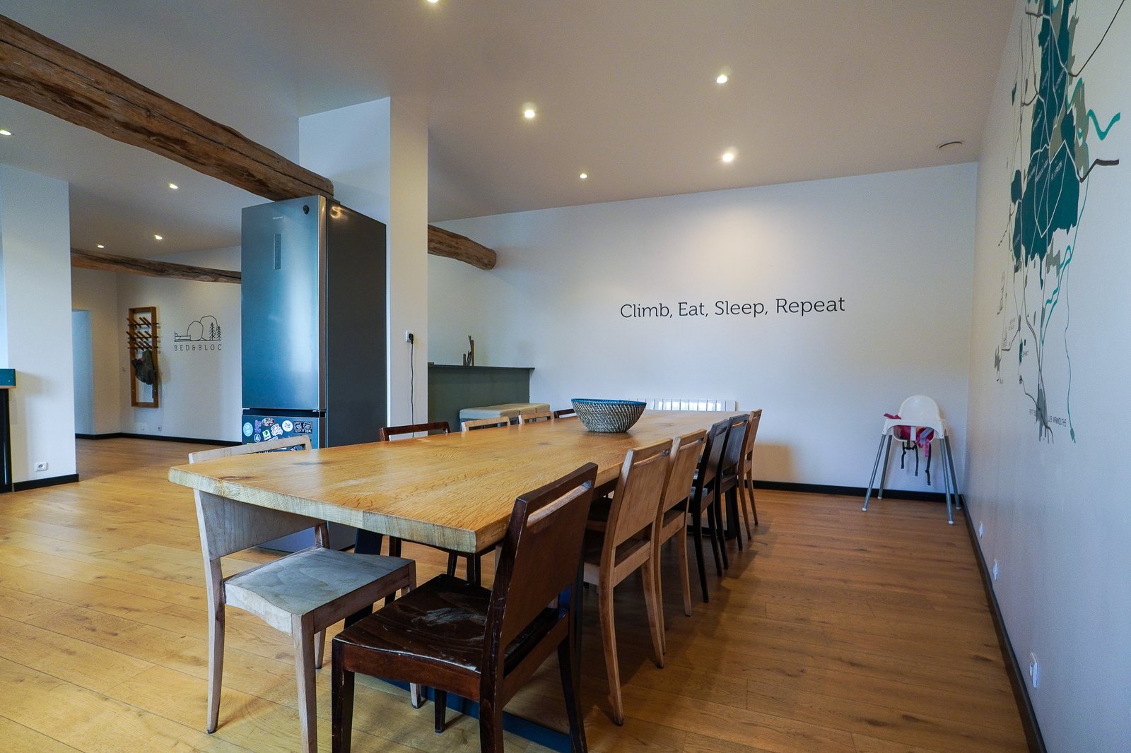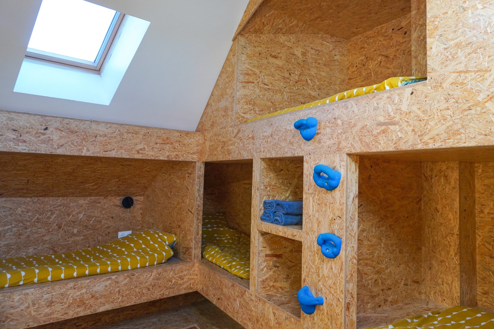 The communal kitchen and the living room were designed to bring a friendly atmosphere for everyone to enjoy their stay and climb their best